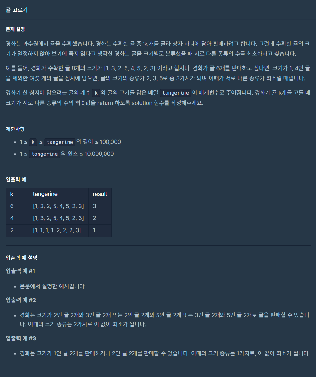 [프로그래머스] 귤 고르기 본문
